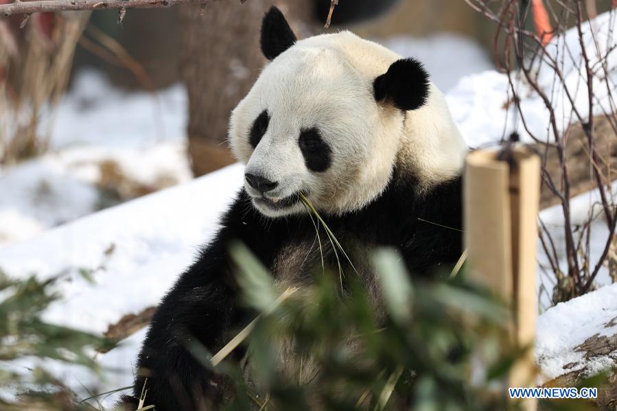 Un panda géant mange du bambou dans une maison du panda géant enneigé à Xining, dans la province du Qinghai (nord-ouest de la Chine), le 21 novembre 2020. (Xinhua/Wu Gang)