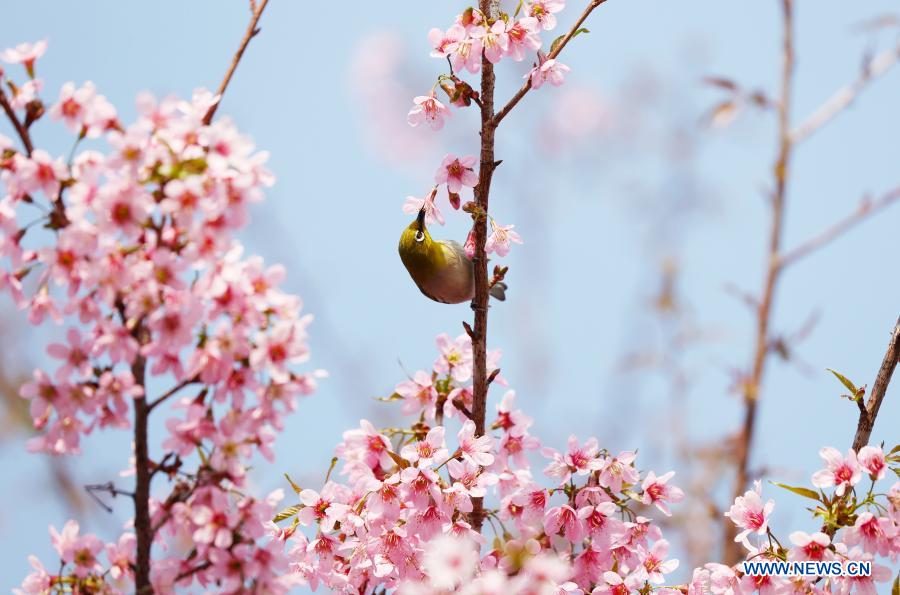 Fleurs de cerisier dans le Temple Kaiyuan à Fuzhou, dans la province chinoise du Fujian (sud-est), le 2 février 2021. (Xinhua/Zhang Jiuqiang)