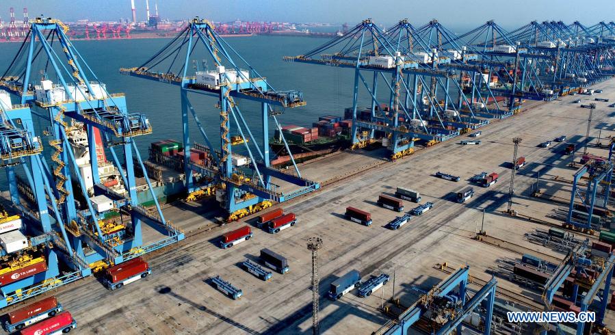QINGDAO, 20 février (Xinhua) -- Photo aérienne de véhicules à guidage automatique dans le quai automatique du port de Qingdao, dans la province chinoise du Shandong (est), le 19 février 2021. Pendant la fête du Printemps cette année, le port de Qingdao a traité 12,47 millions de tonnes de marchandises, soit une augmentation de 12,8% sur un an. (Photo : Zhang Jingang)
