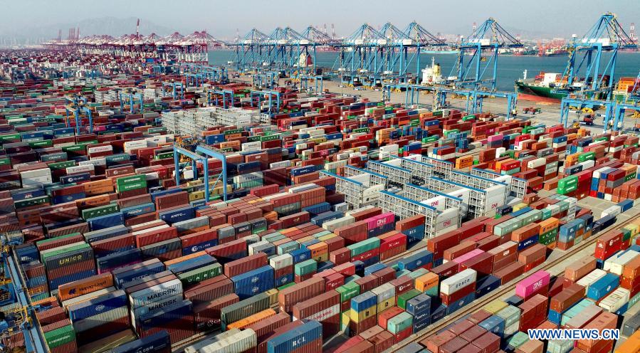 QINGDAO, 20 février (Xinhua) -- Photo aérienne de conteneurs dans le quai automatique du port de Qingdao, dans la province chinoise du Shandong (est), le 19 février 2021. Pendant la fête du Printemps cette année, le port de Qingdao a traité 12,47 millions de tonnes de marchandises, soit une augmentation de 12,8% sur un an. (Photo : Zhang Jingang)