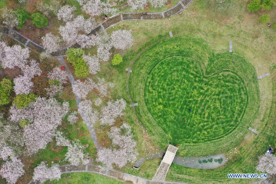Vue aérienne des cerisiers en fleurs dans le site pittoresque de Fenghuanggou dans le district de Nanchang de la province du Jiangxi (est de la Chine), le 20 mars 2021. Les cerisiers ici sont en pleine floraison récemment, attirant de nombreuses personnes à visiter. (Xinhua/Wan Xiang)