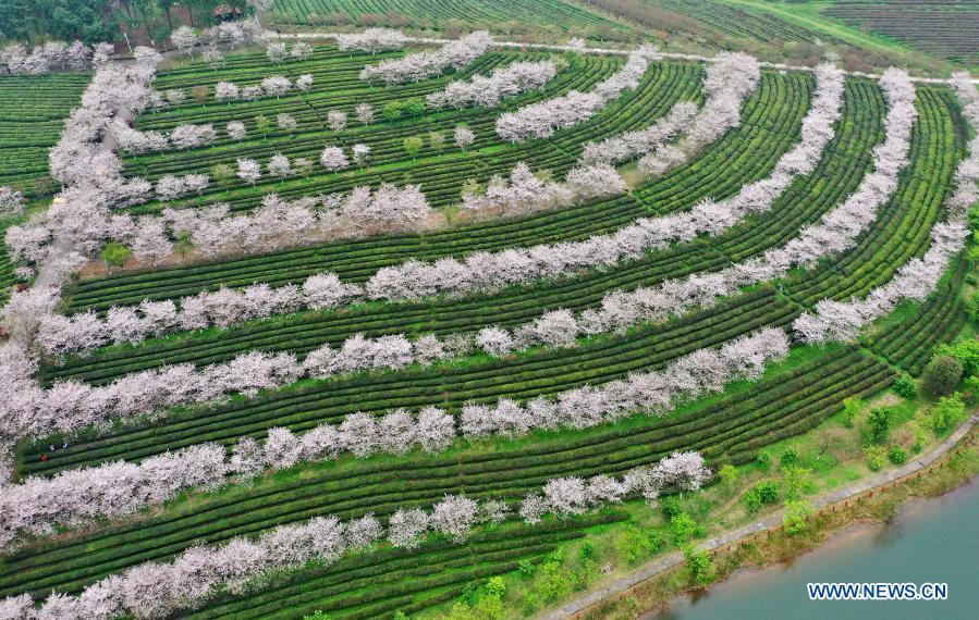 Vue aérienne des cerisiers en fleurs dans le site pittoresque de Fenghuanggou dans le district de Nanchang de la province du Jiangxi (est de la Chine), le 20 mars 2021. Les cerisiers ici sont en pleine floraison récemment, attirant de nombreuses personnes à visiter. (Xinhua/Wan Xiang)