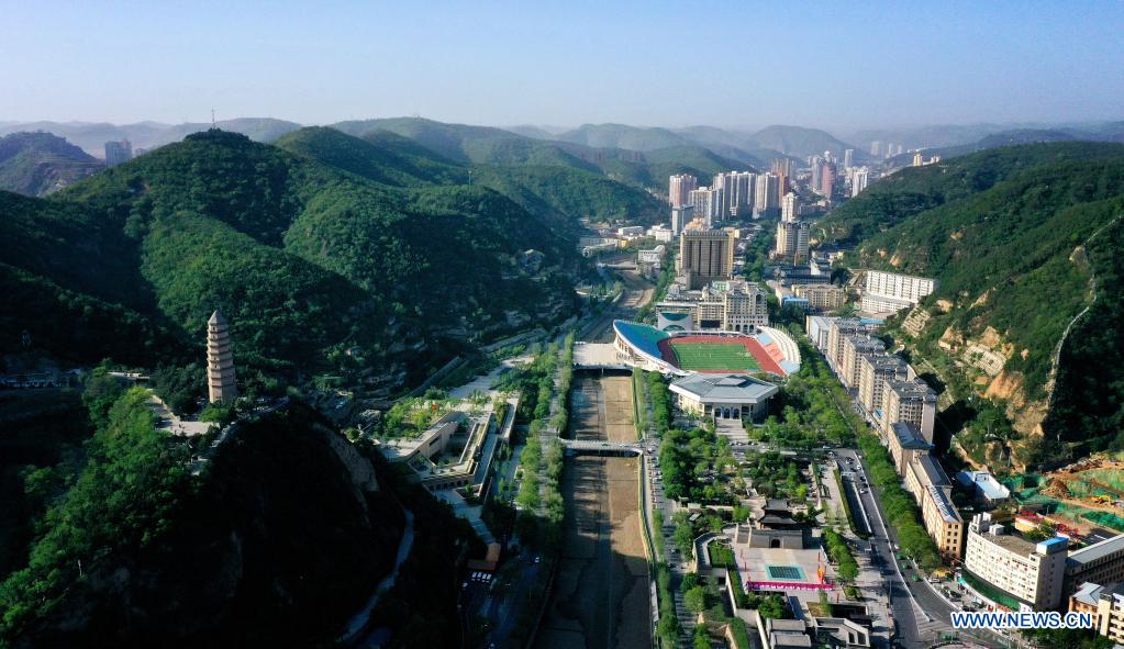 YAN'AN, 27 mai (Xinhua) -- Photo aérienne de la ville de Yan'an, dans la province chinoise du Shaanxi (nord-ouest), le 9 mai 2021. Yan'an a été l'ancien siège du Comité central du Parti communiste chinois entre 1935 et 1948, ainsi que le centre de la révolution communiste de la Chine. Située sur le plateau de Loess, la ville est sortie de la pauvreté et s'est lancée dans un développement écologique. (Photo : Liu Xiao)