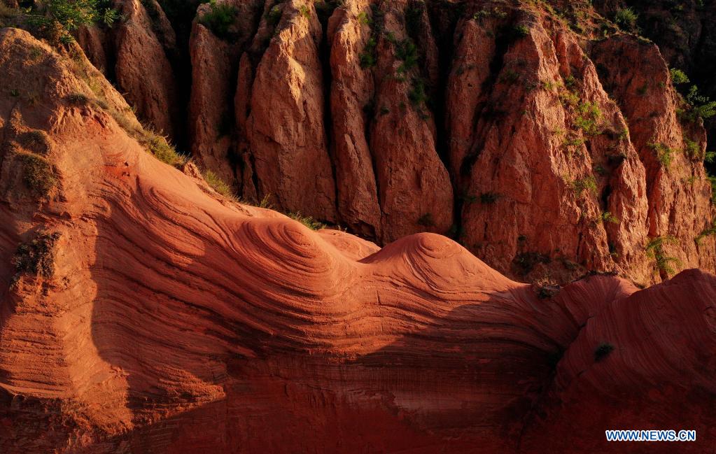 Photo prise le 6 août 2021 montrant le relief Danxia dans le bourg de Longzhou du district de Jingbian, dans la province chinoise du Shaanxi (nord-ouest). (Xinhua/Tao Ming)