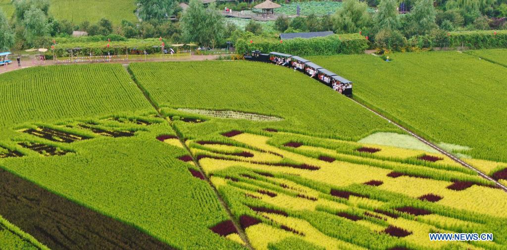 SHENYANG, 19 août (Xinhua) -- Des touristes visitent une rizière en train à Shenyang, dans la province chinoise du Liaoning (nord-est), le 16 août 2021. (Photo : Yang Qing)