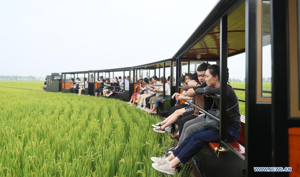 SHENYANG, 19 août (Xinhua) -- Des touristes visitent une rizière en train à Shenyang, dans la province chinoise du Liaoning (nord-est), le 16 août 2021. (Photo : Yang Qing)