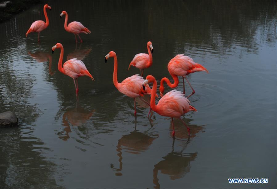 Photo prise le 8 novembre 2018 montrant des flamants roses dans un étang au zoo forestier de Shangfangshan à Suzhou, dans la province chinoise du Jiangsu (est). (Xinhua/Hang Xingwei)