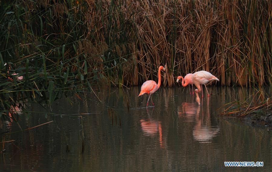 Photo prise le 8 novembre 2018 montrant des flamants roses dans un étang au zoo forestier de Shangfangshan à Suzhou, dans la province chinoise du Jiangsu (est). (Xinhua/Hang Xingwei)