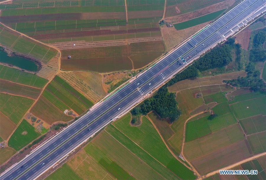 NANNING, 12 novembre (Xinhua) -- Photo aérienne prise le 10 novembre 2018 d'une autoroute reliant Liuzhou à Nanning dans la région autonome Zhuang du Guangxi, dans le sud de la Chine. Le Guangxi s'est attaché à développer un système de transport global, terrestre, aérien et maritime. Ses capacités de transport ont été considérablement améliorées. La région possède 1.751 km de ligne ferroviaire à grande vitesse et 5.000 km d'autoroutes. La capacité de traitement annuelle des ports côtiers et intérieurs a respectivement atteint 250 millions de tonnes et 110 millions de tonnes. Chaque année, environ 30 millions de voyages sont effectués par avion dans le Guangxi. (Photo : Huang Xiaobang)