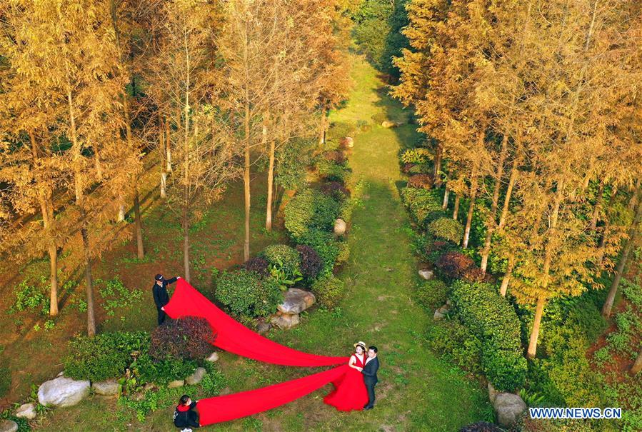 Un couple pose pour des photos de mariage au Parc Nanhu à Hengyang, dans la province du Hunan (centre de la Chine), le 24 novembre 2018. (Xinhua/Cao Zhengping)