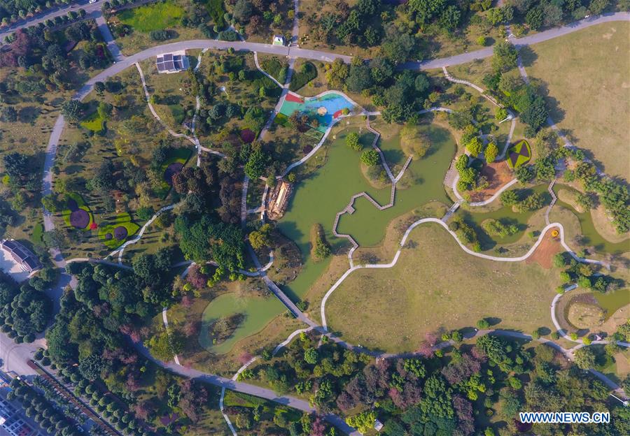 Photo aérienne prise le 28 novembre 2018 montrant le Parc Bandao à Baise, dans la région autonome Zhuang du Guangxi (sud de la Chine). (Xinhua/Zhang Shanchen)