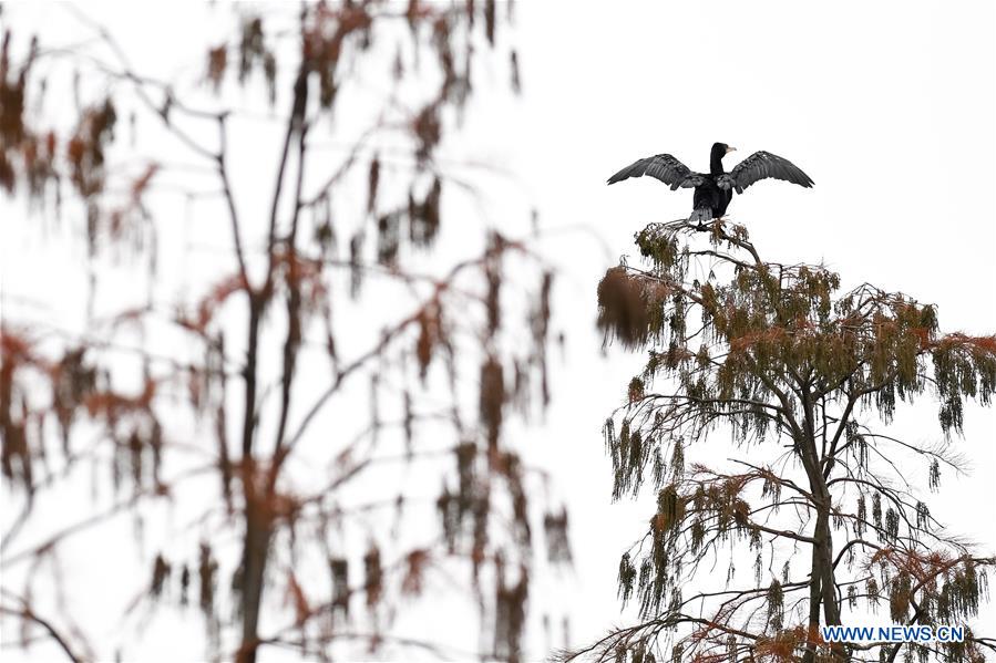 Photo prise le 7 décembre 2018 montrant des cyprès des étangs et un oiseau dans le Parc national de la zone humide du lac Chishan dans le district de Lai'an, dans la province de l'Anhui (est de la Chine). (Xinhua/Zhang Duan)
