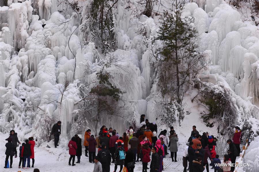 Des touristes admirent des glaçons au site pittoresque de Dadunxia dans la préfecture autonome Hui de Linxia, dans la province du Gansu(nord-ouest de la Chine), le 16 décembre 2018. (Xinhua/Shi Youdong)