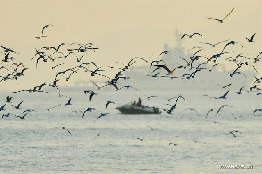Des mouettes survolent les eaux près de la jetée de Zhanqiao, site emblématique de Qingdao, dans la province chinoise du Shandong (est), le 18 décembre 2018. (Xinhua/Wang Haibin)