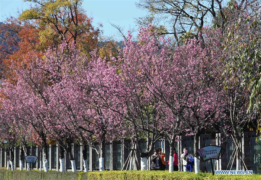 Photo prise le 21 décembre 2018 montrant des fleurs le long d'un trottoir dans l'arrondissement de Xishan à Kunming, dans la province du Yunnan (sud-ouest de la Chine). (Xinhua/Yang Zongyou)
