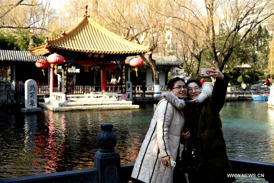 Des touristes prennent un selfie dans le Parc de la Source Baotu à Jinan, capitale de la province du Shandong (est de la Chine), le 5 janvier 2019. (Xinhua/Wang Kai)