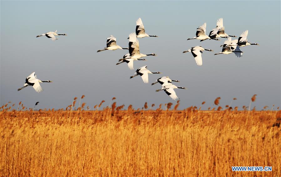 Photo prise le 10 janvier 2019 montrant des grues à couronne rouge dans la réserve naturelle nationale de Zhalong à Qiqihar, dans la province chinoise du Heilongjiang (nord-est). (Xinhua/Wang Jianwei)