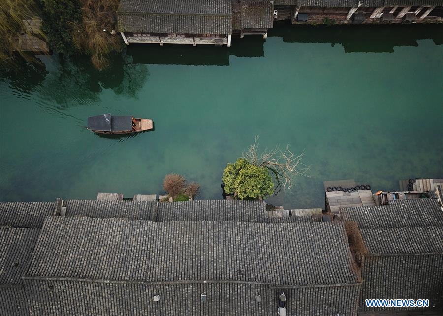 Photo aérienne prise le 25 février 2019 montrant le paysage de Wuzhen, à Tongxiang, dans la province du Zhenjiang (est de la Chine). (Xinhua/Weng Xinyang)