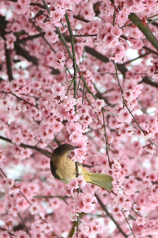 Photo prise le 14 mars 2019 montrant un oiseau sur un arbre en fleurs dans un jardin écologique à Zunyi, dans la province chinoise du Guizhou (sud-ouest). (Xinhua/Mu Mingfei)