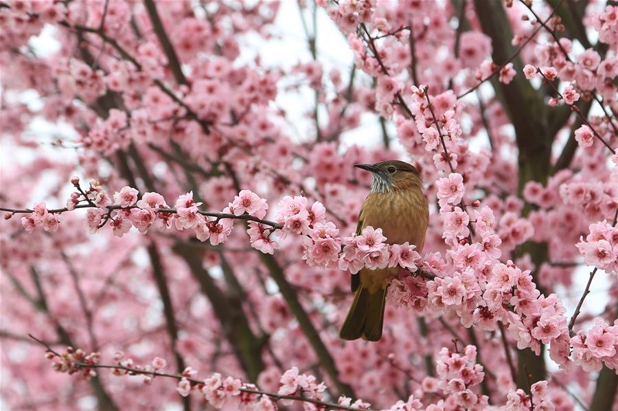 Photo prise le 14 mars 2019 montrant un oiseau sur un arbre en fleurs dans un jardin écologique à Zunyi, dans la province chinoise du Guizhou (sud-ouest). (Xinhua/Mu Mingfei)
