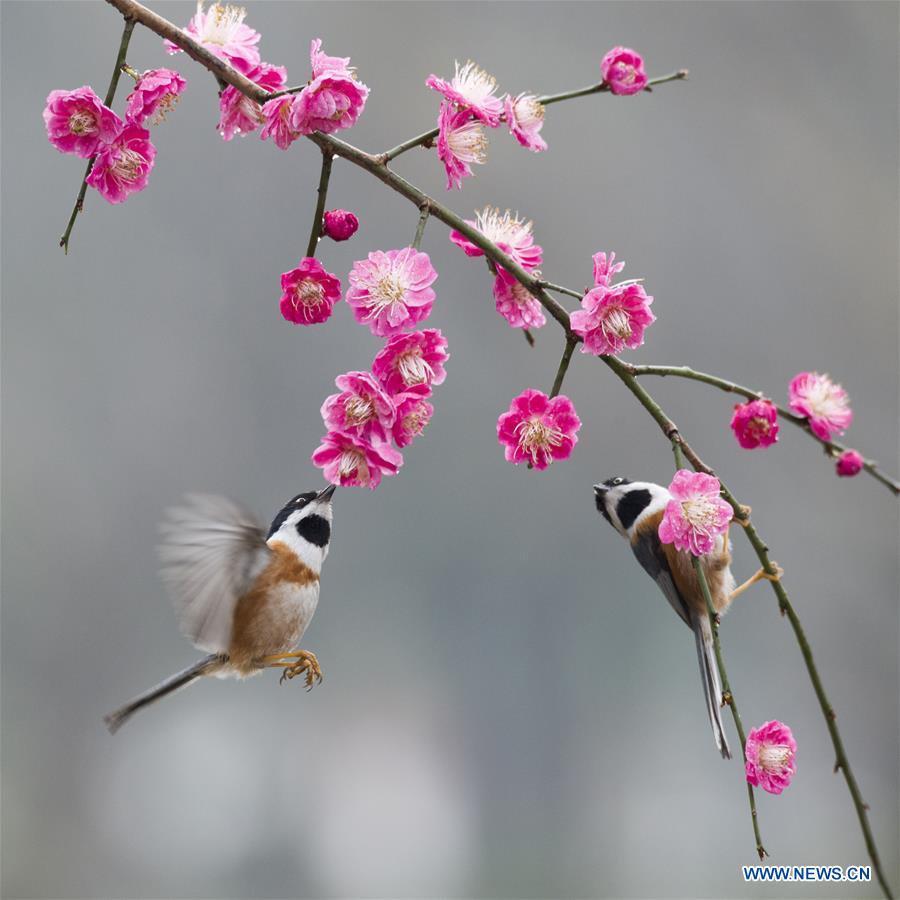 Des oiseaux se rassemblent autour de fleurs de prunier à Wuxi, dans la province chinoise du Jiangsu (est), le 18 mars 2019. (Xinhua/Pan Zhengguang)