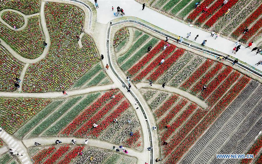 Photo aérienne prise le 23 mars 2019 montrant des fleurs dans un jardin écologique dans la ville de Shanghai (est de la Chine). (Xinhua/Fang Zhe)