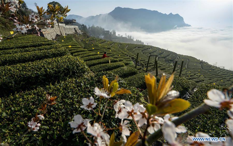 Des paysans cueillent des feuilles de thé dans une plantation de thé à Enshi, dans la province du Hubei (centre de la Chine), le 25 mars 2019. (Photo : Wen Lin)