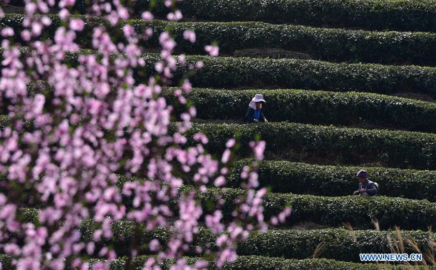 Des paysans cueillent des feuilles de thé dans une plantation de thé dans le district de Danzhai, dans la province chinoise du Guizhou (sud-ouest), le 25 mars 2019. (Photo : Yang Wukui)