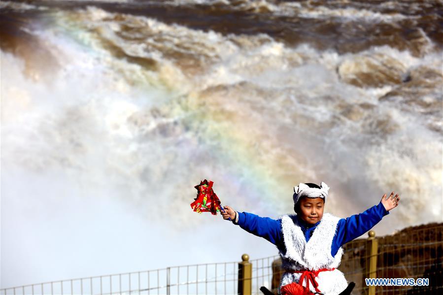 Un enfant pose devant la cascade Hukou sur le fleuve Jaune, dans le district de Jixian, dans la province du Shanxi (nord de la Chine), le 30 mars 2019. (Xinhua/Su Qiang)