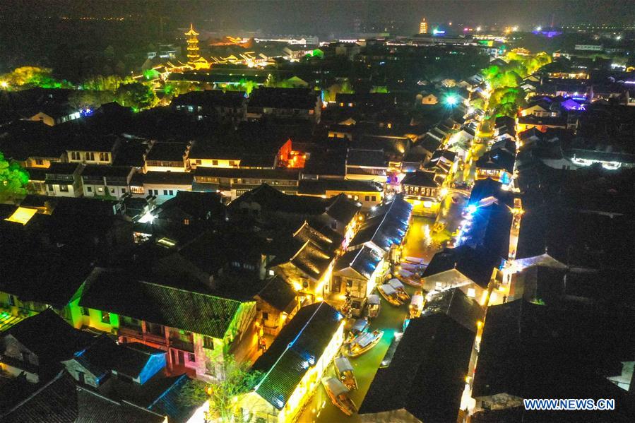 Photo aérienne prise le 5 avril 2019 montrant la vue nocturne du bourg ancien de Zhouzhuang à Kunshan, dans la province du Jiangsu (est de la Chine). (Xinhua/Yang Lei)