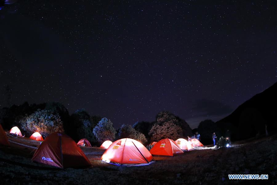 Des enthousiastes d'activités en plein air campent près des rhododendrons sauvages en fleurs dans le district de Yanbian à Panzhihua, dans la province chinoise du Sichuan (sud-ouest), le 23 avril 2019. Plus de 66.667 hectares de rhododendrons sauvages s'épanouissent de février à mai dans le district de Yanbian. (Xinhua/Jiang Hongjing)