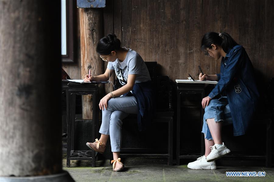 Des visiteurs dessinent au village pittoresque de Hongcun du district de Yixian, dans la province chinoise de l'Anhui (est), le 24 avril 2019. (Xinhua/Zhang Duan)