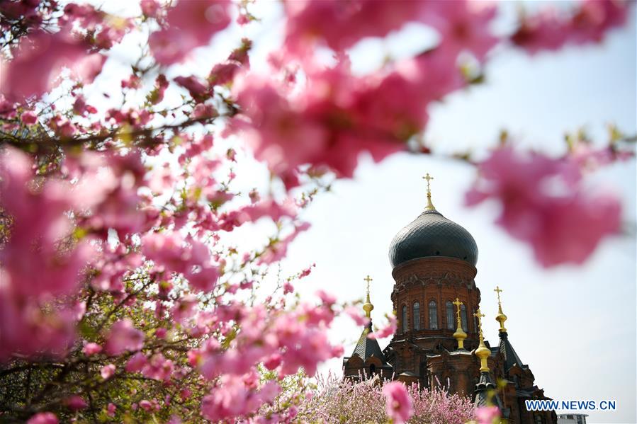 Photo prise le 29 avril 2019 montrant des fleurs épanouies et la cathédrale Sainte-Sophie, à Harbin, capitale de la province chinoise du Heilongjiang (nord-est). (Xinhua/Wang Jianwei)