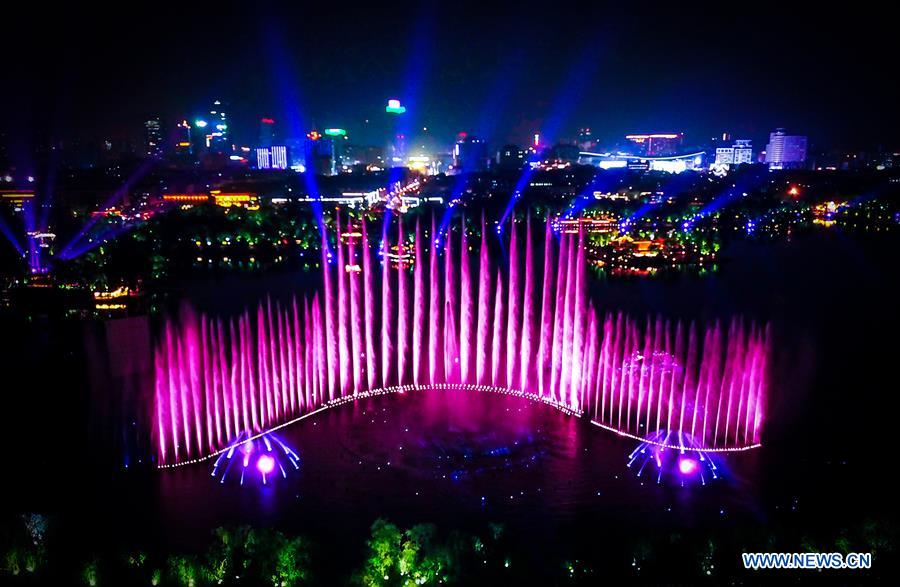 JI'NAN, 11 mai (Xinhua) -- Spectacle d'arts visuels sur le lac Daming à Ji'nan, dans la province du Shandong (est), le 10 mai 2019. (Photo : Cheng Jingxu)