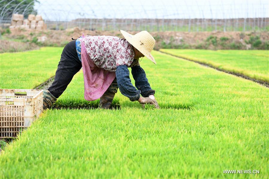 Une agricultrice récolte des semis de riz dans les champs au bourg de Liuzhen dans le district de Quanjiao de la province de l'Anhui (centre de la Chine), le 13 mai 2019. (Xinhua/Liu Junxi)