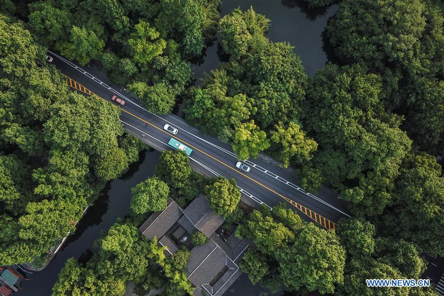 Photo aérienne prise le 24 mai 2019 montrant des voitures roulant sur la chaussée de Yanggongdi dans la zone pittoresque du lac de l'Ouest à Hangzhou, dans la province du Zhejiang (est de la Chine). (Xinhua/Huang Zongzhi)