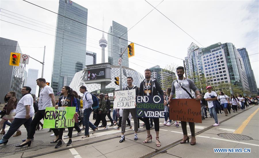Des gens portant des chaussures à talons hauts participent à l'événement Walk a Mile in Her Shoes, à Toronto, au Canada, le 29 mai 2019. Plus de 500 personnes ont pris part à cet événement annuel visant à sensibiliser les gens à la lutte contre les violences sexistes. (Xinhua/Zou Zheng)