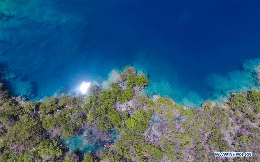 Photo aérienne prise le 5 juin 2019 montrant la vue du lac Jinghai dans le Parc national de Jiuzhaigou dans la province du Sichuan (sud-ouest de la Chine). (Xinhua/Xue Yubin)