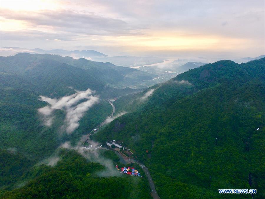 Photo aérienne prise le 26 juin 2019 montrant le paysage du site pittoresque de Shibachongxi après une pluie à Fuzhou, dans la province du Fujian (sud-est de la Chine). (Xinhua/Jiang Kehong)