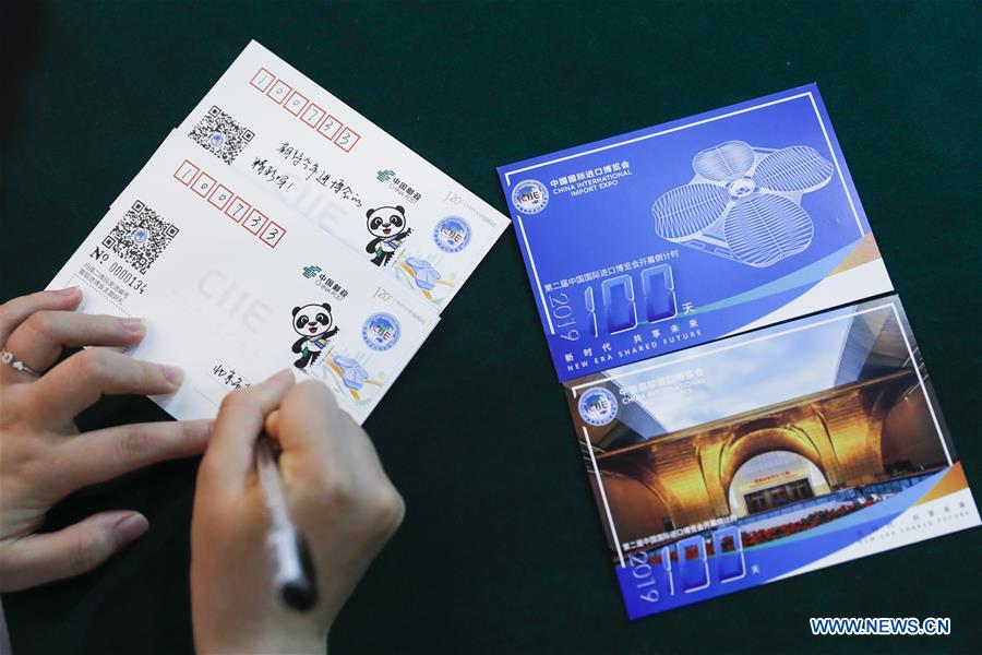 SHANGHAI, 27 juillet (Xinhua) -- Un visiteur écrit des cartes postales personnalisées pour la deuxième Exposition internationale d'importation de la Chine (CIIE) à Shanghai (est de la Chine), le 25 juillet 2019. Le lancement de ces cartes postales spéciales a été organisé jeudi au Centre national des expositions et des congrès de Shanghai. (Photo : Shen Bohan)