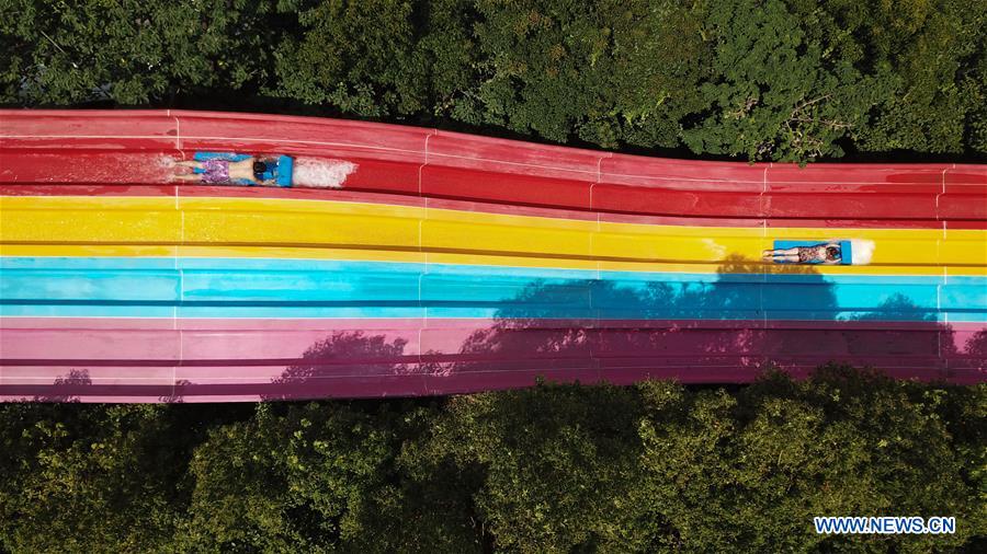 Photo aérienne prise le 28 juillet 2019 montrant des gens s'amusant dans un parc aquatique à Hefei, capitale de la province de l'Anhui (est de la Chine). (Xinhua/Zhang Duan)
