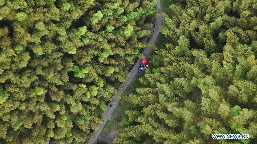 Photo aérienne prise le 3 août 2019 montrant le paysage du site pittoresque de la forêt de bambou de Mukeng au district de Yixian à Huangshan, dans la province de l'Anhui (est de la Chine). (Xinhua/Zhang Duan)