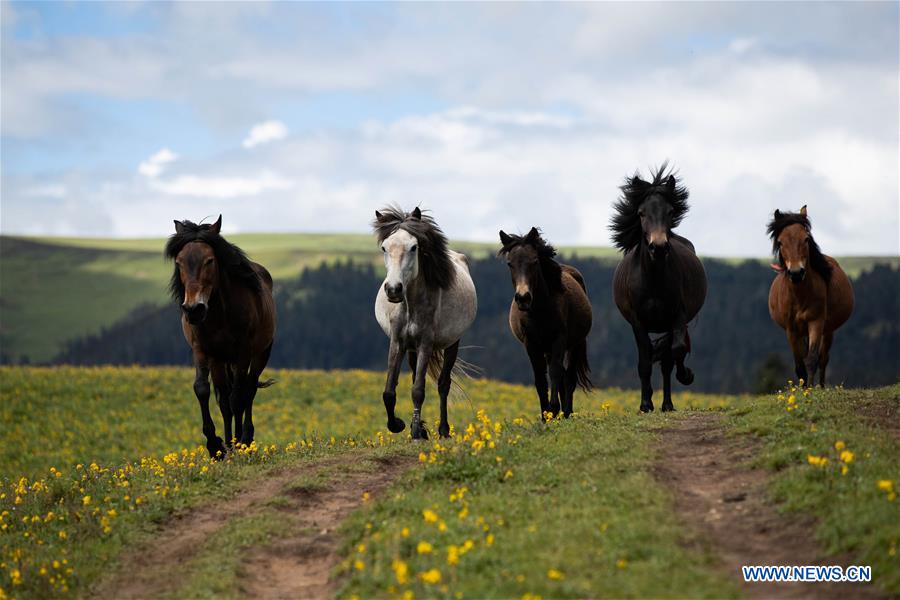 Des chevaux courent sur la prairie dans le bourg de Xi'eluo du district de Yajiang, dans la province du Sichuan (sud-ouest de la Chine), le 5 août 2019. (Xinhua/Jiang Hongjing)