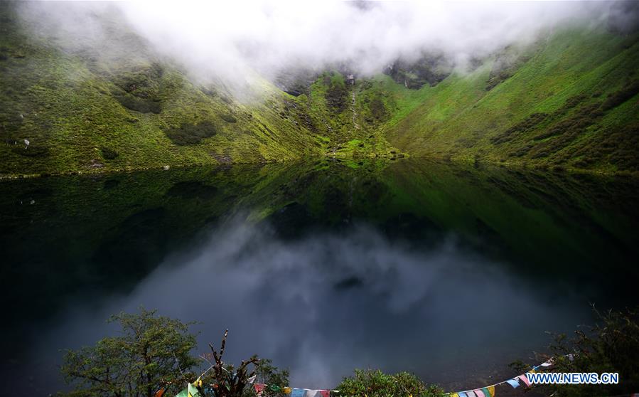 LHASSA, 23 août (Xinhua) -- Paysage du lac Lhanggyi Tso dans le district de Gyirong à Xigaze, dans la région autonome du Tibet (sud-ouest de la Chine), le 20 août 2019. (Photo : Chogo)