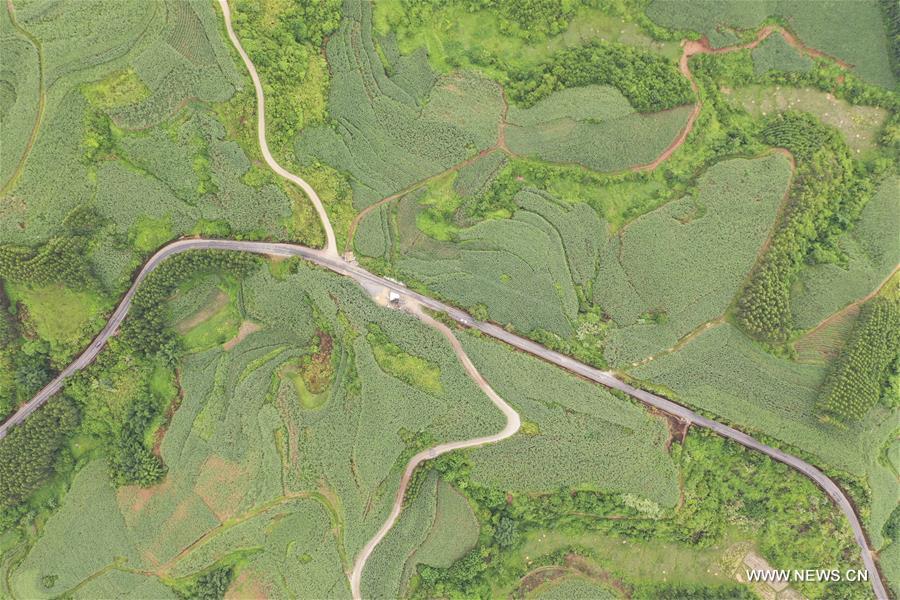 Photo aérienne prise le 22 août 2019 montrant les champs dans la réserve naturelle du mont Shiwan dans le district de Shangsi de la région autonome Zhuang du Guangxi (sud de la Chine). (Xinhua/Cao Yiming)