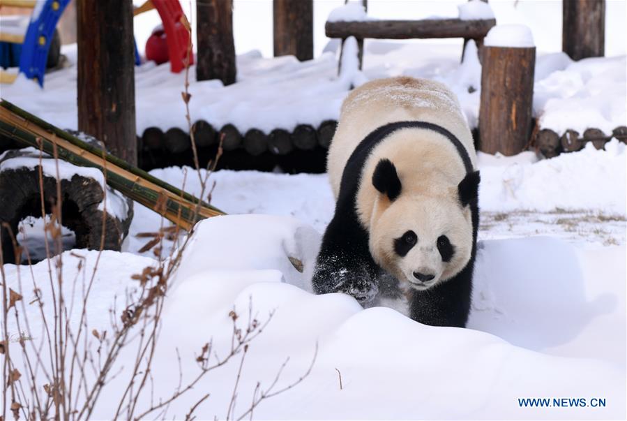 Photo prise le 18 novembre 2019 montrant le panda géant Mu Yun dans un parc animalier après la neige à Changchun, dans la province du Jilin (nord-est de la Chine). (Xinhua/Lin Hong)