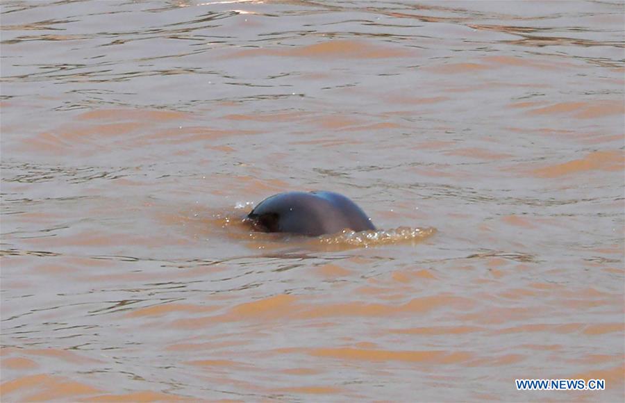 YICHANG, 4 août (Xinhua) -- Un marsouin aptère nage dans le fleuve Yangtsé à Yichang, dans la province chinoise du Hubei, le 3 août 2020. Le marsouin aptère, une espèce endémique de Chine, est un indicateur important de l'écologie du Yangtsé. (Photo : Lei Yong)