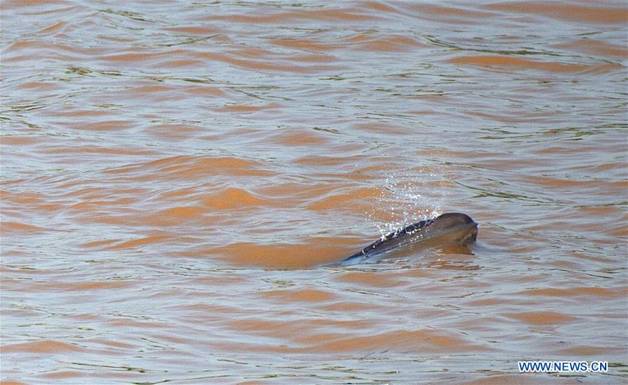 YICHANG, 4 août (Xinhua) -- Un marsouin aptère nage dans le fleuve Yangtsé à Yichang, dans la province chinoise du Hubei, le 3 août 2020. Le marsouin aptère, une espèce endémique de Chine, est un indicateur important de l'écologie du Yangtsé. (Photo : Lei Yong)