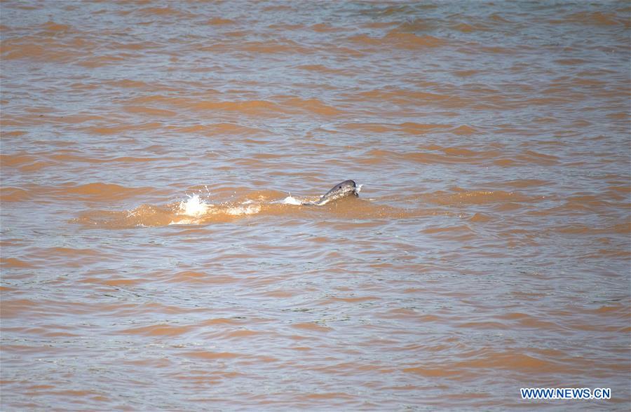 YICHANG, 4 août (Xinhua) -- Un marsouin aptère nage dans le fleuve Yangtsé à Yichang, dans la province chinoise du Hubei, le 3 août 2020. Le marsouin aptère, une espèce endémique de Chine, est un indicateur important de l'écologie du Yangtsé. (Photo : Lei Yong)