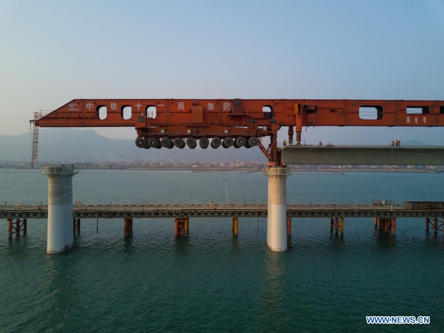 PUTIAN, 9 janvier (Xinhua) -- Pose des poutrelles du pont de la baie de Meizhou du chemin de fer à grande vitesse Fuzhou-Xiamen, dans la province chinoise du Fujian (sud-est), le 8 janvier 2021. Le chantier se poursuit malgré les températures basses et le vent glacial dus à une vague de froid. (Photo : Song Weiwei)